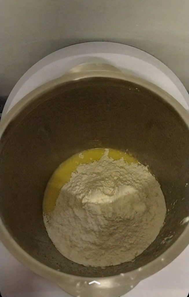 Fügen Sie dann das Mehl, das Backpulver hinzu und mischen Sie erneut.