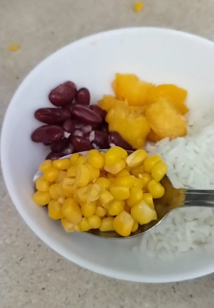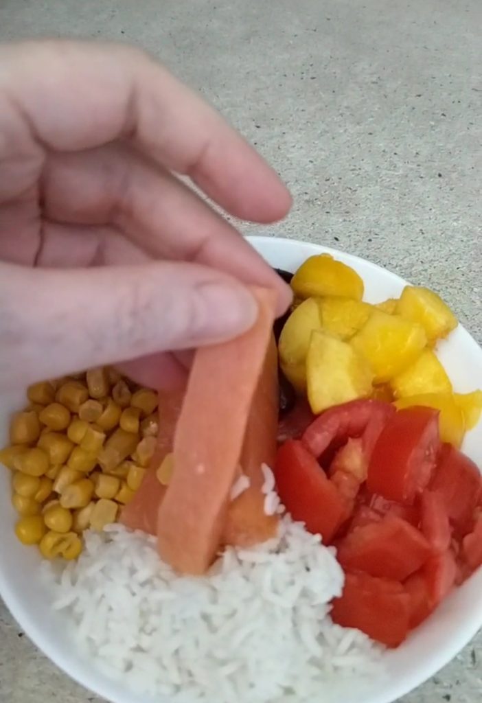 Fügt dann die roten Bohnen, die in Würfel geschnittenen Pfirsiche und den Mais hinzu. Ihr könnt den Pfirsich durch Wassermelone ersetzen und auch dünn geschnittene Gurke hinzufügen, wenn ihr mögt.