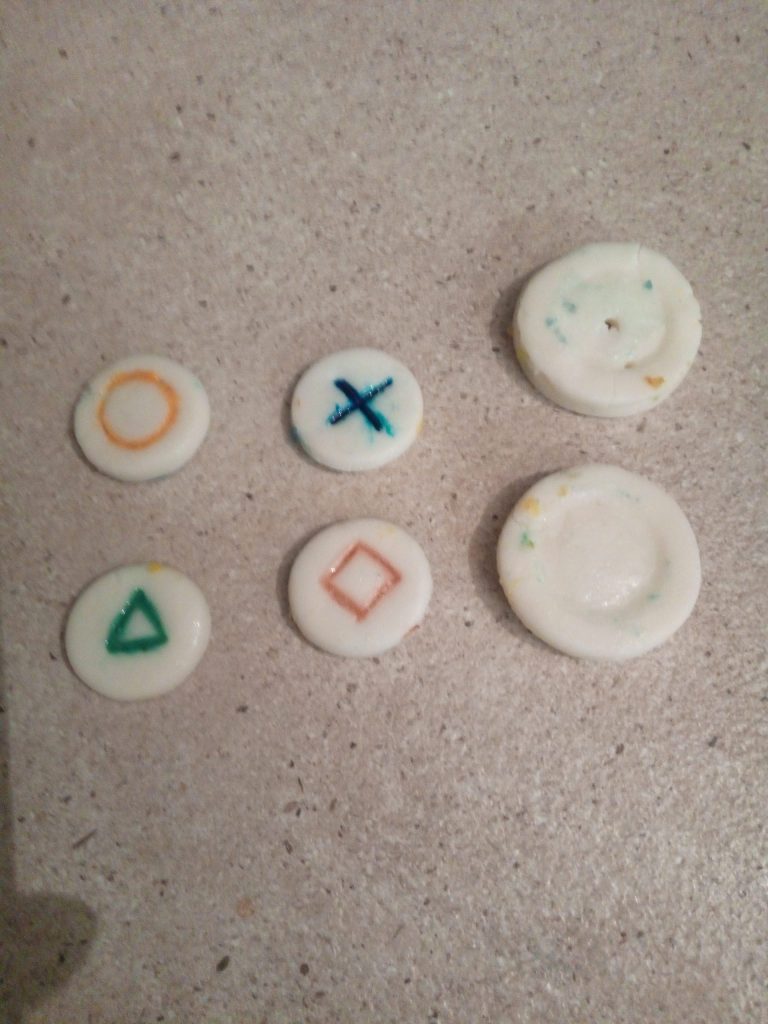 Bereiten Sie nun die Verzierungen mit der weißen Zuckerpaste vor: Schneiden Sie vier Kreise mit einem Durchmesser von 3 cm für die Bedienelemente, vier mit einem Durchmesser von 4 cm für die Analogsticks, die Sie paarweise zusammenfügen, indem Sie sie mit wenig Wasser anfeuchten.