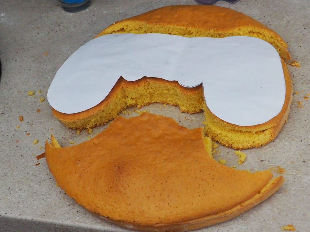 Zeichnen Sie die Form der PS4-Konsole auf ein Stück Papier, legen Sie es auf die Torte und schneiden Sie die Konturen aus.