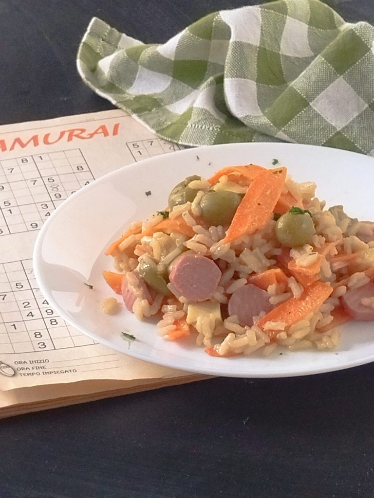 Schneiden Sie zuletzt vier Würstchen in Ringe und fügen Sie sie dem Reissalat hinzu.