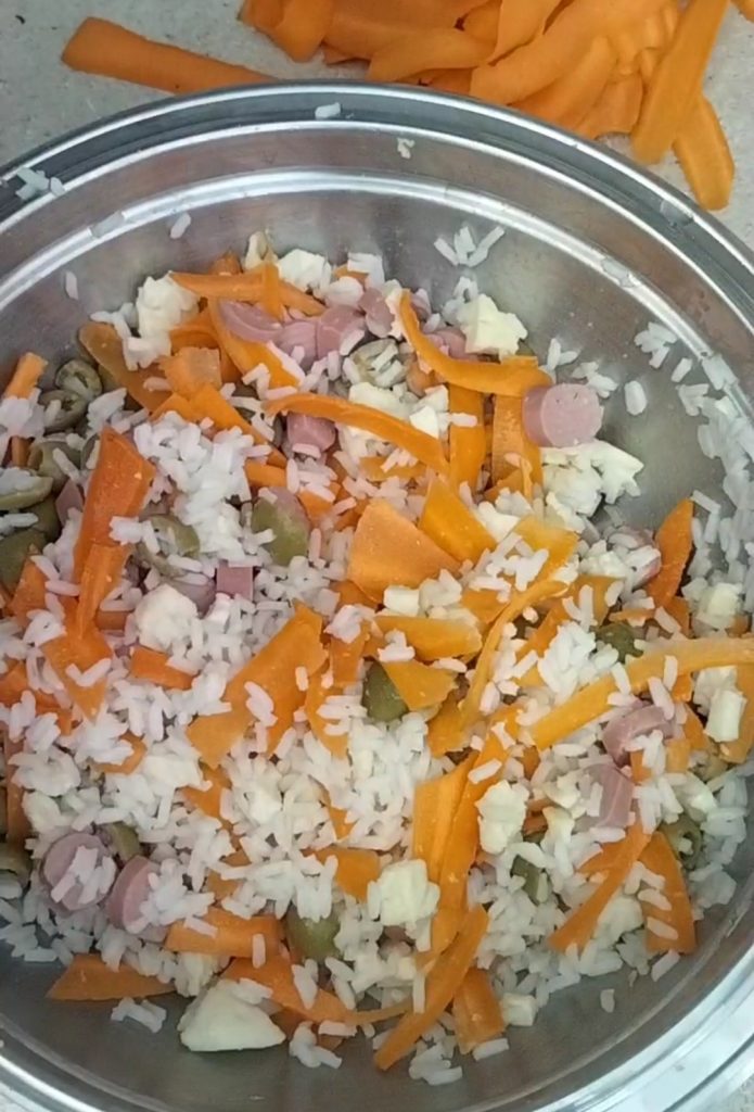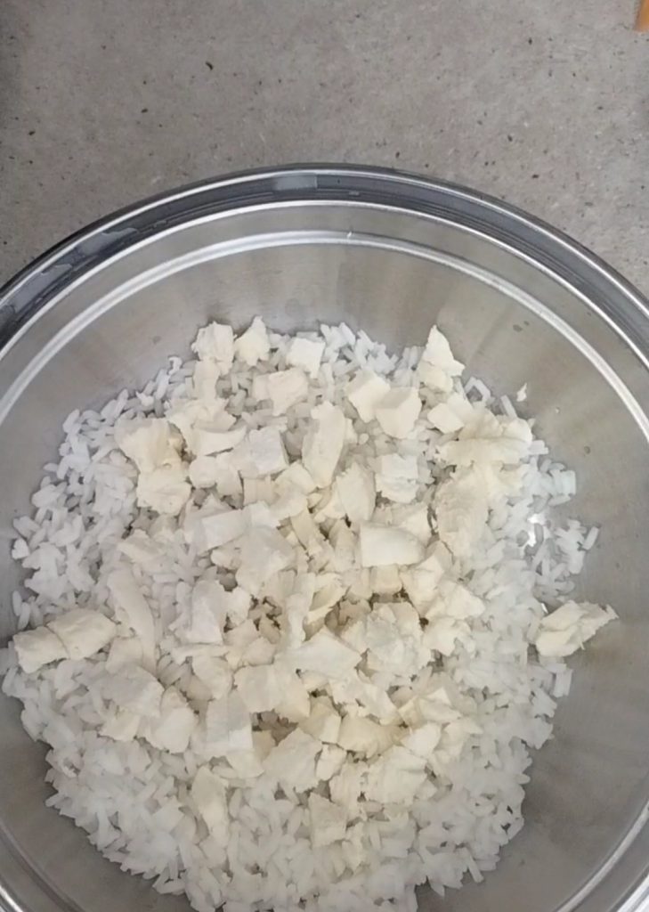 Geben Sie den mittlerweile kalten Reis in eine Schüssel, fügen Sie die in Würfel geschnittenen Mozzarellas hinzu.