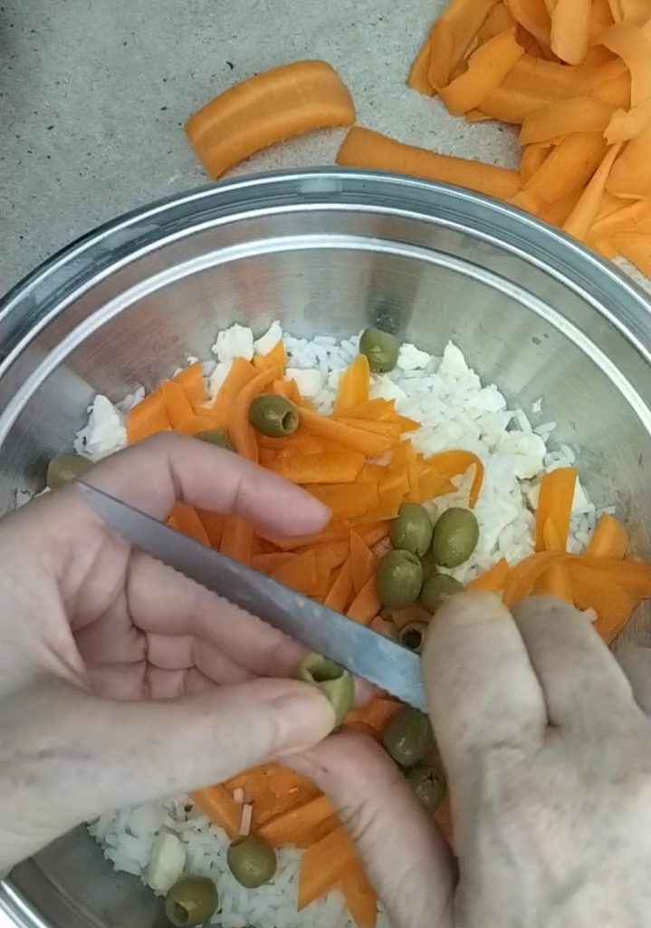 Nun die Oliven aus ihrem Wasser abtropfen lassen und in die Schüssel geben. Ich habe sie halbiert, aber Sie können sie auch ganz lassen, wenn Sie möchten.