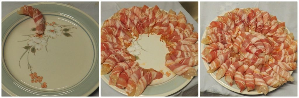 • Die Baconscheiben halbieren, dann eine halbe Scheibe Bacon um jede Riesengarnele wickeln.