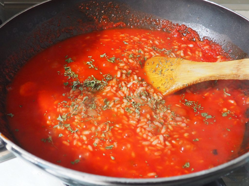Fügen Sie nun die Tomatenpassata hinzu und nach und nach die Brühe. Rühren Sie den Reis um und fügen Sie weitere Brühe hinzu, wenn er trocken aussieht, bis er gar ist.