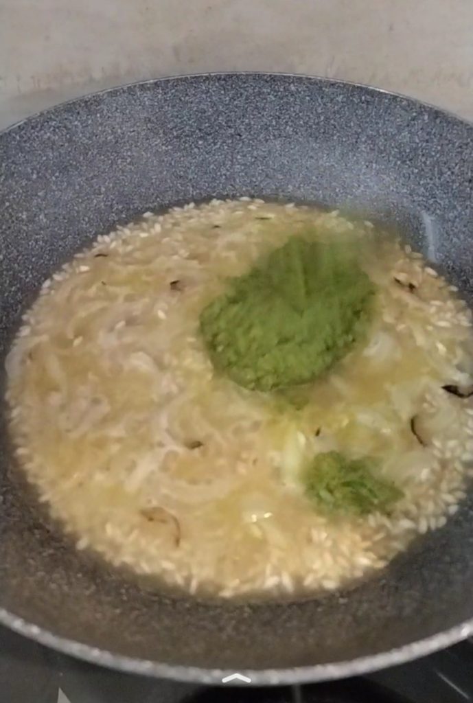 Wenn der Reis trocknet, geben Sie nach und nach etwas Brühe hinzu und rühren Sie gelegentlich. Fügen Sie auch den Ingwer hinzu, je nach Geschmack. Weiter kochen, indem Sie nach und nach etwas Wasser hinzufügen, wenn es trocknet, und nach Geschmack salzen.