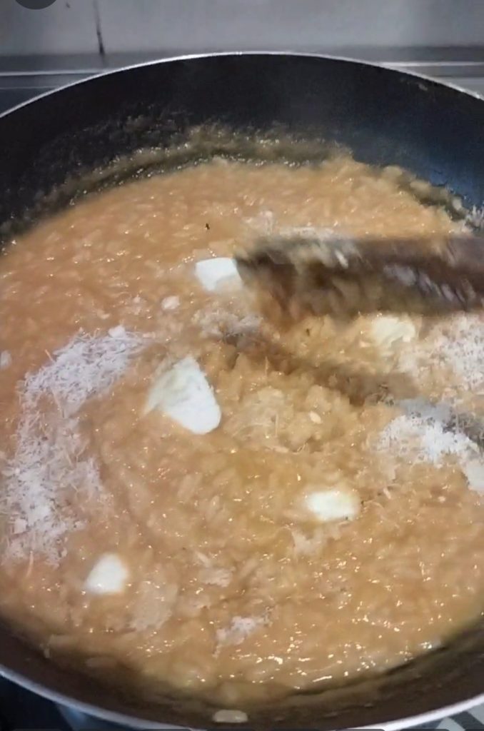 Gelegentlich umrühren und nach und nach die Brühe hinzufügen, wenn sie trockener wird.