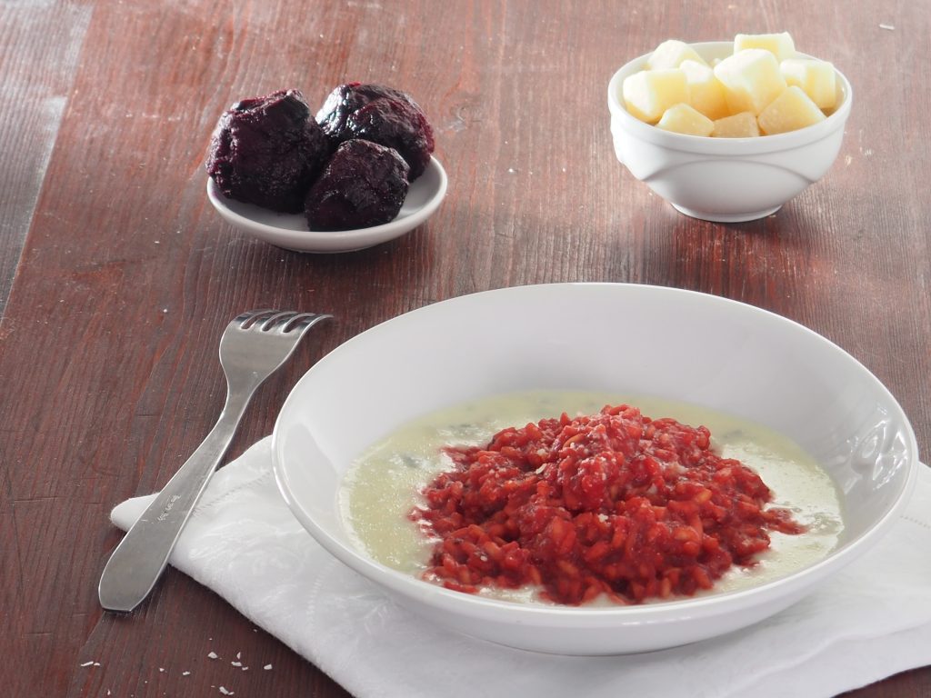 In einem tiefen Teller eine Kelle Gorgonzola-Sauce als Basis geben, dann den Rote-Bete-Reis hinzufügen.