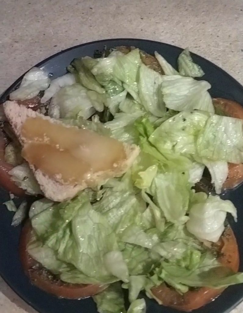 • Legen Sie die Hälfte der Tomaten und die Hälfte des gewürzten Salats auf einen Teller.