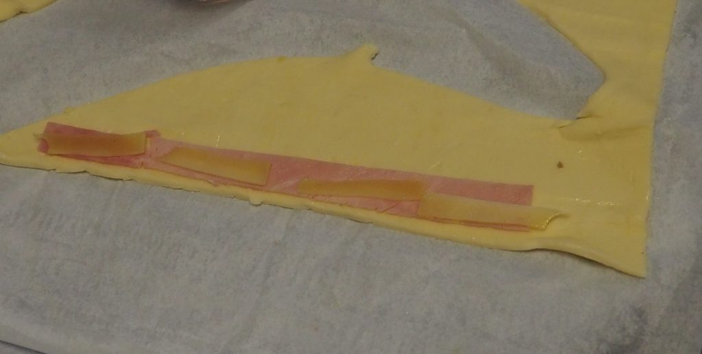 Legen Sie Streifen von Schinken auf den Blätterteig und darauf Käsestreifen.
