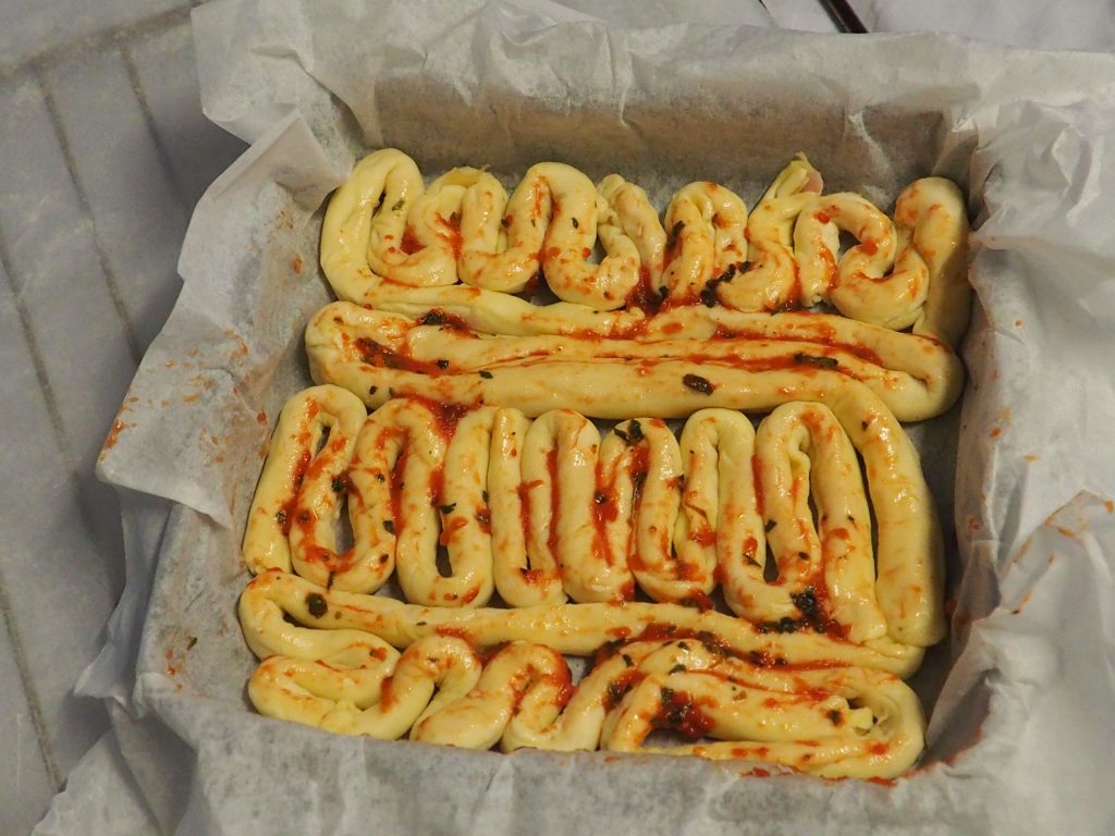 Nehmen Sie nun ein quadratisches Backblech von 20×20 cm, bedecken Sie es mit Backpapier und legen Sie die gefüllten Streifen unregelmäßig darauf. Sie sollen den Eindruck von Darmschlingen erwecken.