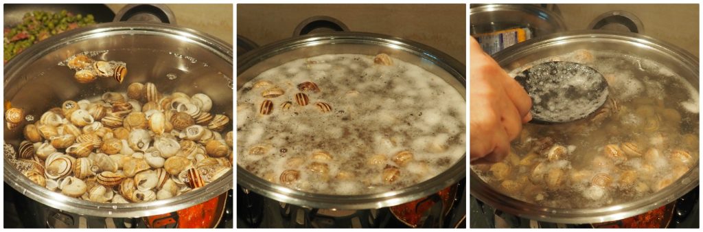 Schalten Sie dann die Hitze aus, entfernen Sie den Schaum mit einem Schaumlöffel und lassen Sie die Schnecken in einem Sieb abtropfen.