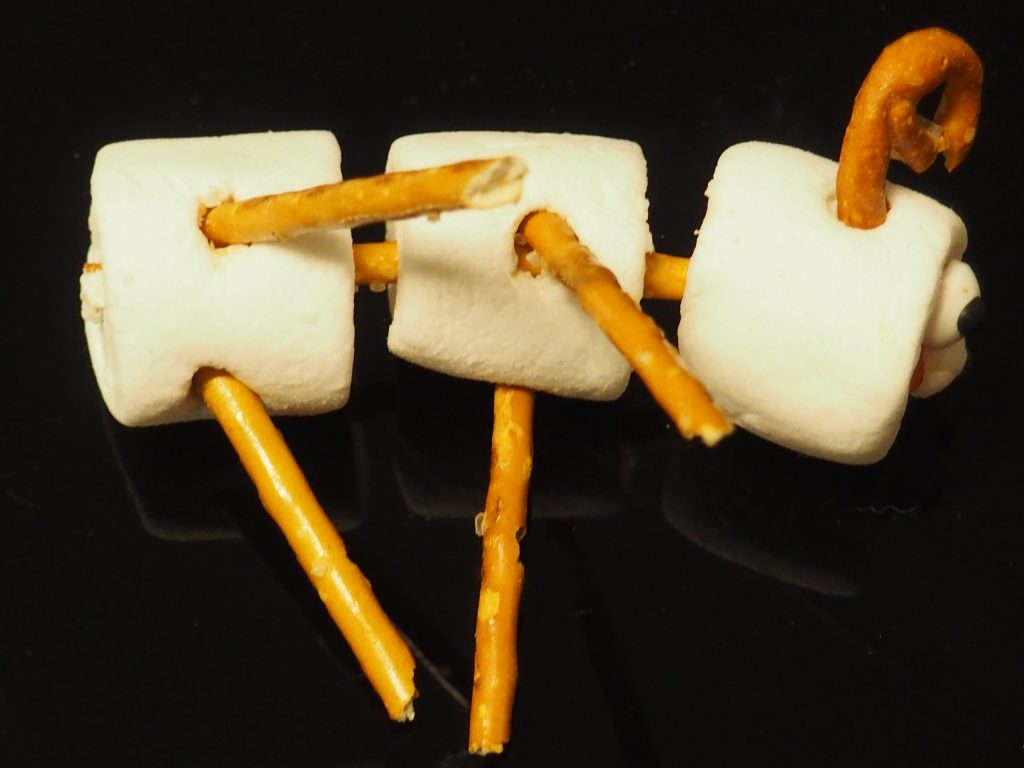 • Steckt nun das salzige Stäbchen in das mittlere Marshmallow und fügt die anderen beiden oben und unten an. So erhaltet ihr den Körper des Schneemanns.