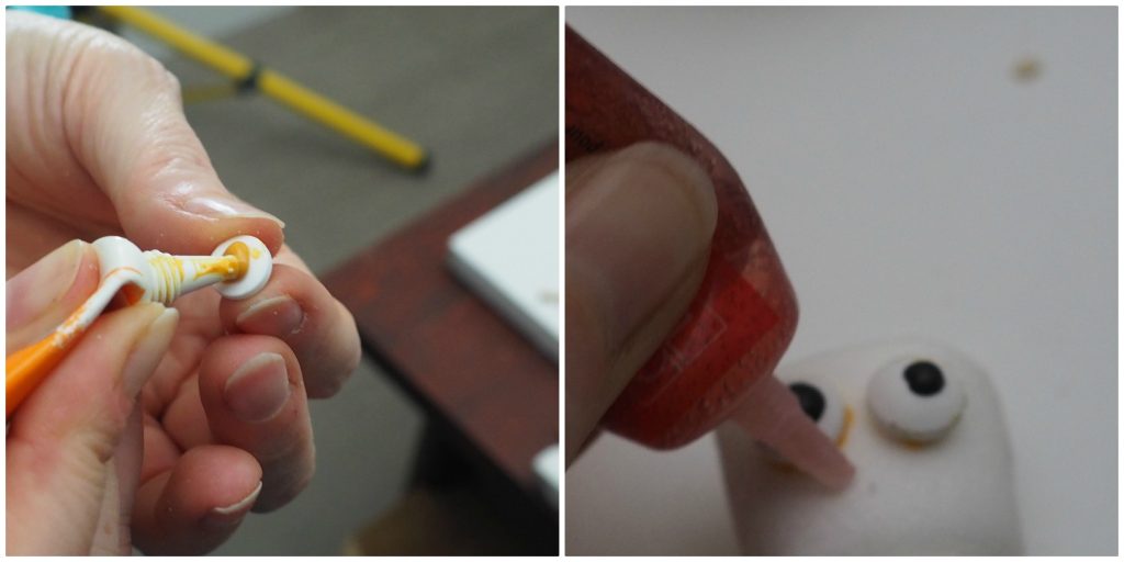 • Tragt auf die Rückseite der Augen ein wenig Inhalt des Lebensmittelstiftes auf (den ihr als Klebstoff verwendet) und befestigt sie auf dem Kopf des Schneemanns.