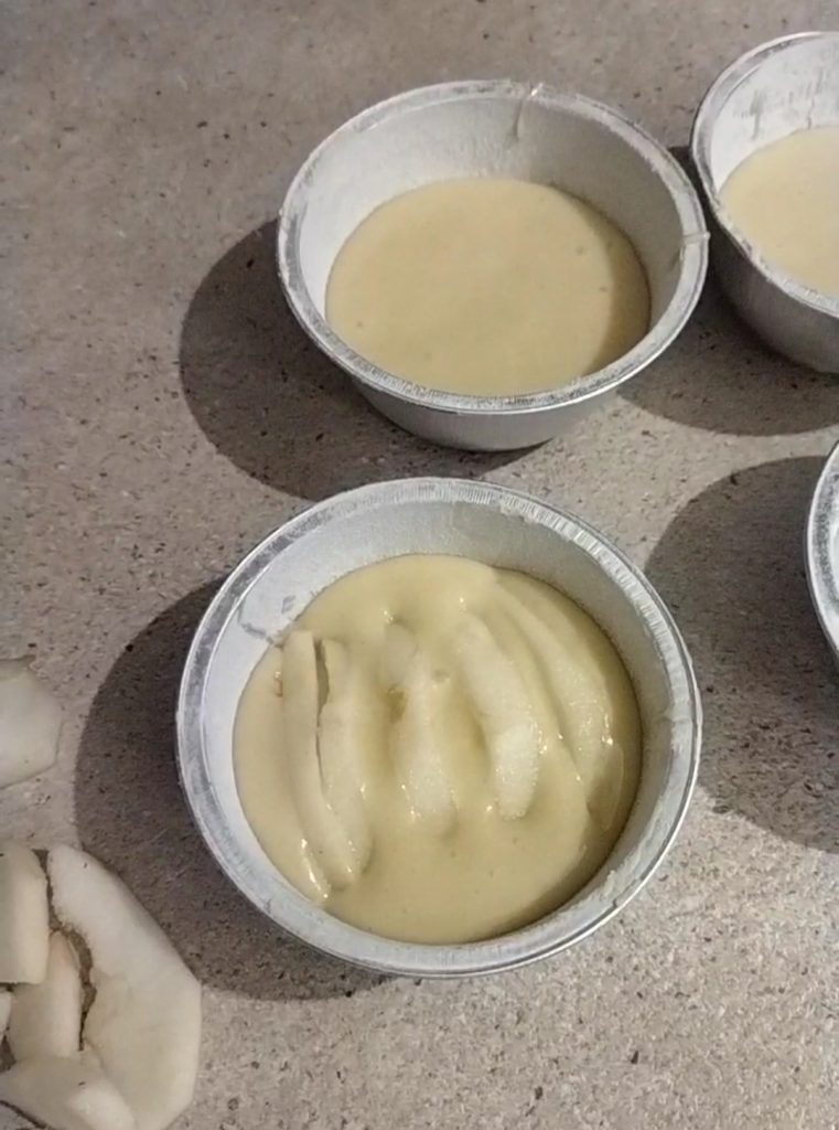 Füllen Sie vier Förmchen etwa zur Hälfte. Waschen, schälen und schneiden Sie die Äpfel in Scheiben. Legen Sie einige Scheiben in die Mischung in den Förmchen.