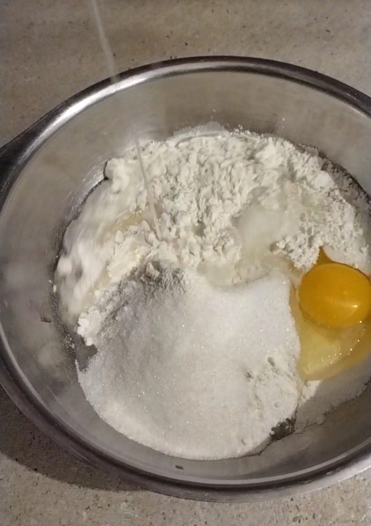 Geben Sie alle Zutaten in eine Schüssel: das Mehl, das Backpulver, den Zucker, das Ei, die Milch, das Öl.