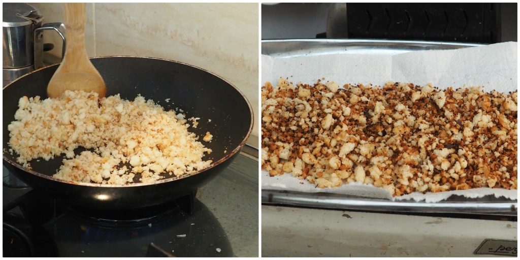 Gebt zwei Esslöffel Öl in eine Pfanne und bratet das gehackte Toastbrot an, bis es goldbraun ist.