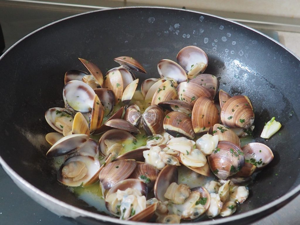 • Geben Sie in eine Pfanne das Öl, den Knoblauch und die Venusmuscheln.