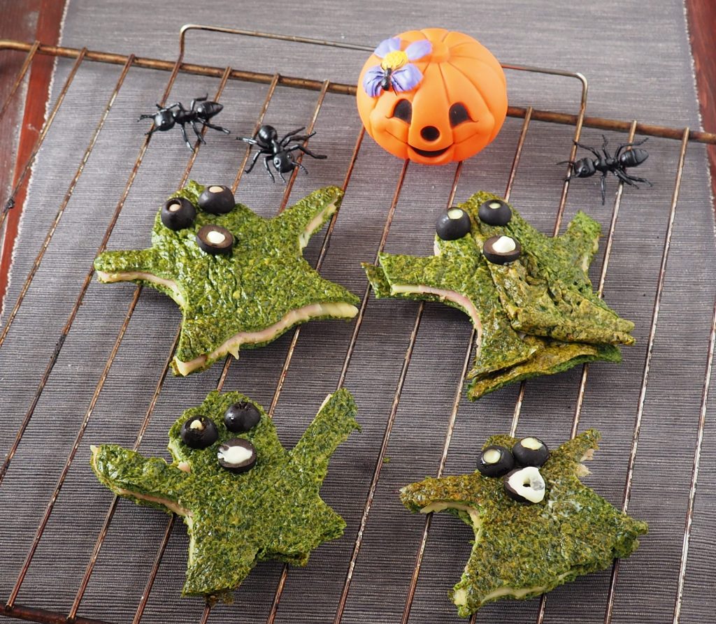 Verwenden Sie ein Messer, um die Geisterform entlang der Umrisse auszuschneiden. Machen Sie das gleiche mit den übrigen Geisterformen.Nehmen Sie nun eine halbe Olive für die Augen und befestigen Sie sie mit etwas Mayonnaise. Für den Mund verwenden Sie ein Stück Olive oder, wenn Sie möchten, auch etwas Mayonnaise.