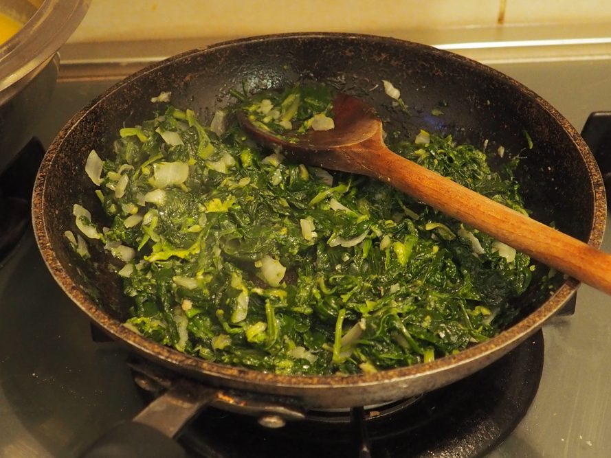 In der Zwischenzeit schält die Zwiebel und den Knoblauch, gebt sie in einen Mixer und hackt sie fein. Bratet sie in einer Pfanne mit Butter zusammen mit dem Spinat, den ihr vorher aufgetaut, gut ausgedrückt (von 200 g erhaltet ihr ungefähr 120 g ausgedrücktes Gewicht) und mit einem Messer gehackt habt, an. Lasst es ein paar Minuten anbraten, fügt den Parmigiano hinzu, mischt gut und schmeckt, falls nötig, mit Salz ab.