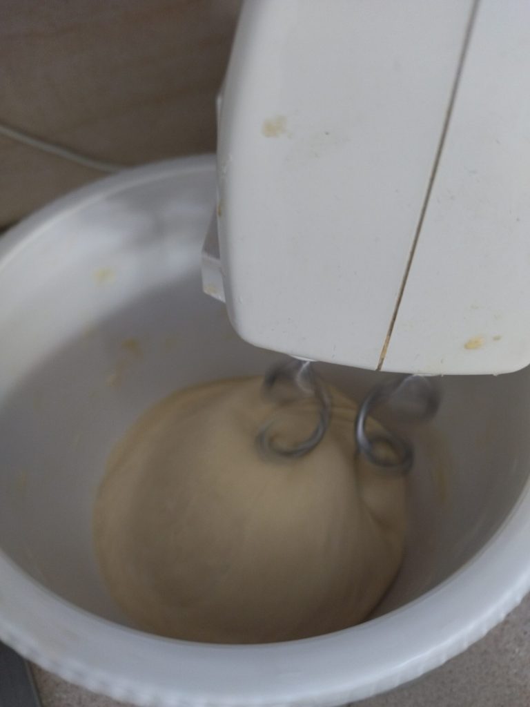 Nehmen Sie den Teig aus dem Mixer, geben Sie ihn in eine mit Mehl bestäubte Schüssel und decken Sie ihn mit Frischhaltefolie ab. Lassen Sie ihn 2/3 Stunden an einem warmen und trockenen Ort gehen, er sollte sich mindestens verdoppeln.
