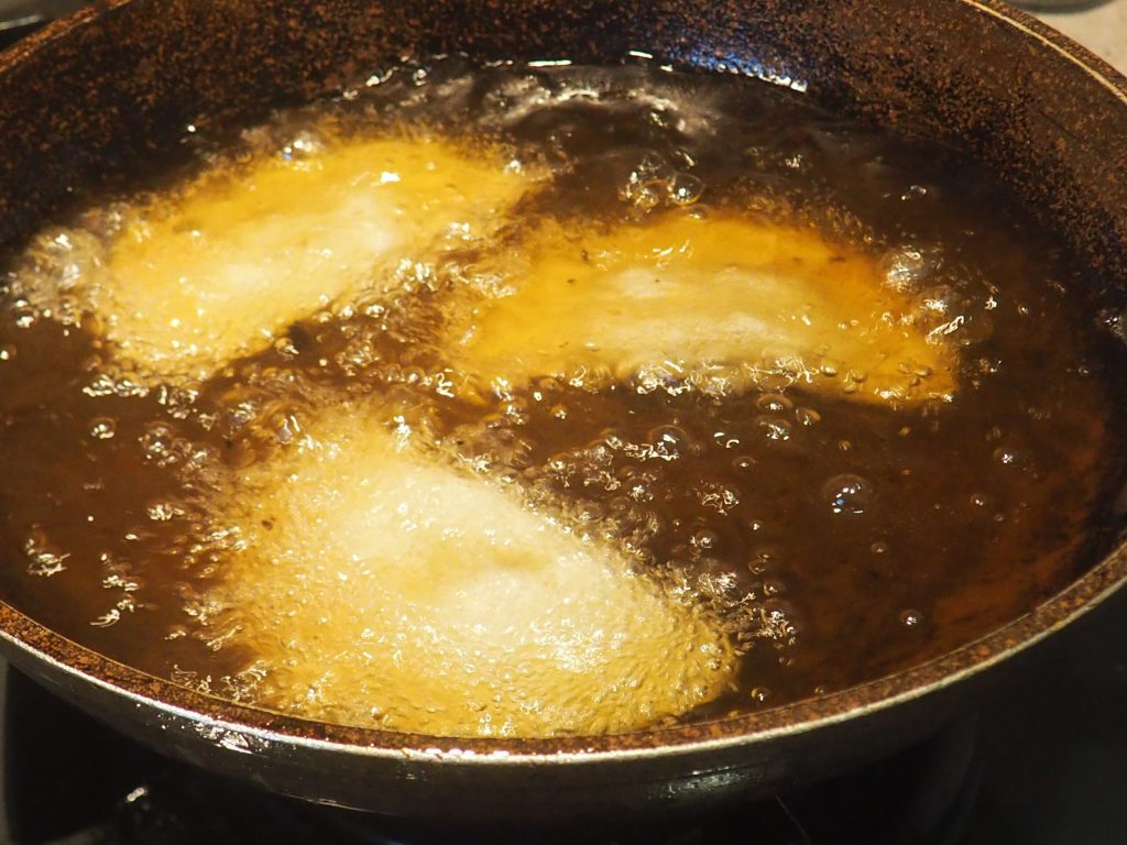 In einer Pfanne etwa 500 ml Pflanzenöl zum Frittieren erhitzen. Das Öl ist bereit, wenn ein Teigball sofort an die Oberfläche steigt.