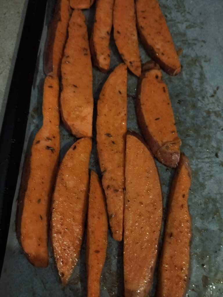 • Legen Sie die Kartoffelspalten auf ein mit Backpapier ausgelegtes Backblech, beträufeln Sie sie mit etwas Öl, dann streuen Sie geräuchertes Paprikapulver, Kreuzkümmel, Salz und Pfeffer darüber. Sie können die Menge an Paprika und Kreuzkümmel nach Ihrem Geschmack variieren. Backen Sie sie bei etwa 200° für etwa 15-20 Minuten. Überprüfen Sie die Garzeit, die Kartoffel sollte weich sein. Um die Oberfläche zu bräunen, schalten Sie den Grill für ein paar Minuten ein, achten Sie darauf, dass sie nicht verbrennen.