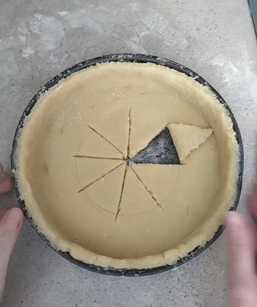 • Einen Keksausstecher in die Mitte der Form legen, um die Länge der Dreiecksseite zu kennzeichnen. Mit einem Messer acht kleine Dreiecke von der Mitte nach außen ausschneiden.