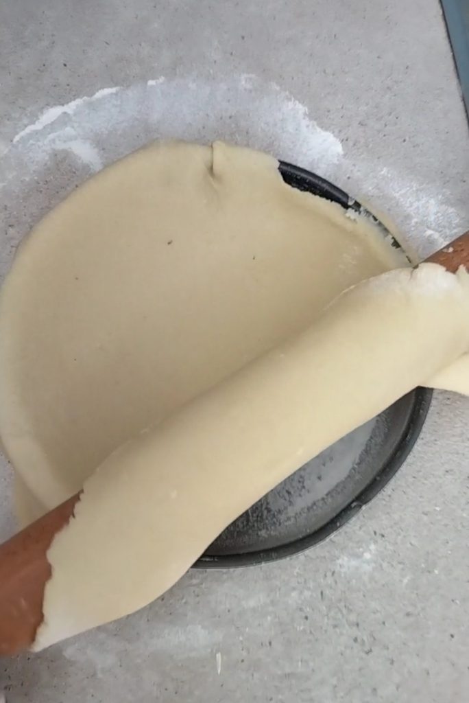 • Eine Form mit einem Durchmesser von 22 cm einfetten und mit Mehl bestäuben. Den Teig aus dem Kühlschrank nehmen, mit einem Nudelholz ausrollen und die Form damit auskleiden.