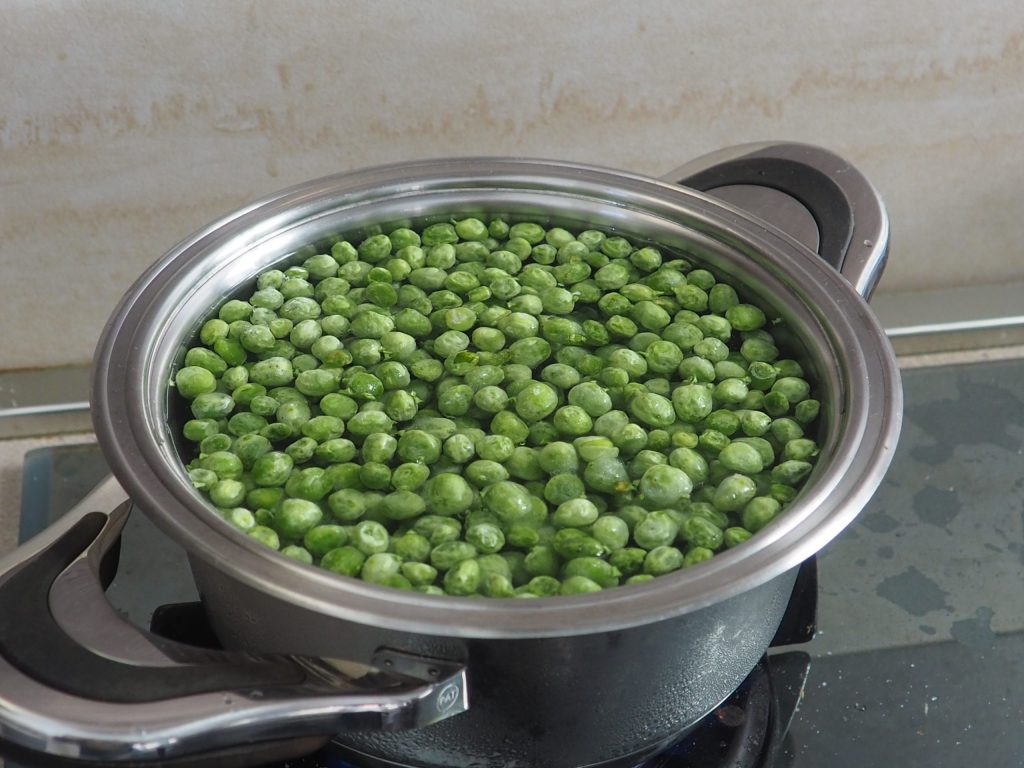 Kochen Sie die Erbsen in einem kleinen Topf mit Salzwasser für etwa 30 Minuten, bis sie weich sind.