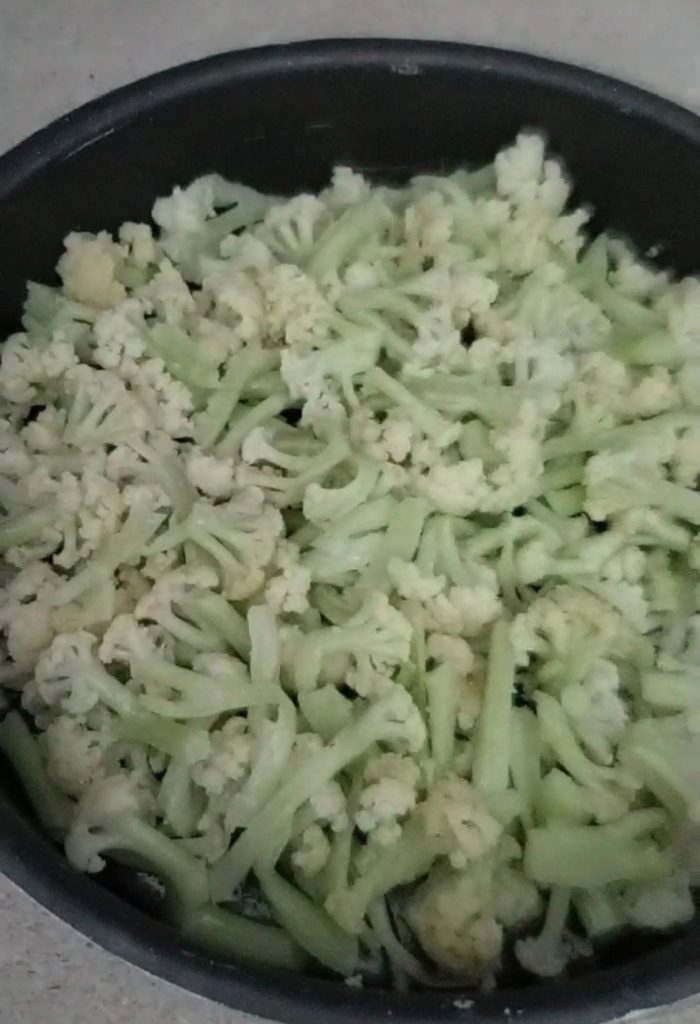 Fetten Sie eine Form mit einem Durchmesser von 26 cm mit etwas Öl ein, geben Sie die vorgekochten Blumenkohlstücke hinein, die nicht zu groß sind, und salzen Sie die Oberfläche leicht, falls nötig. Sie können auch die vorgekochten Blumenkohlstücke einfrieren, so sind sie gebrauchsfertig. In den Notizen habe ich einige Schritte beschrieben, falls Sie dies selbst tun möchten.