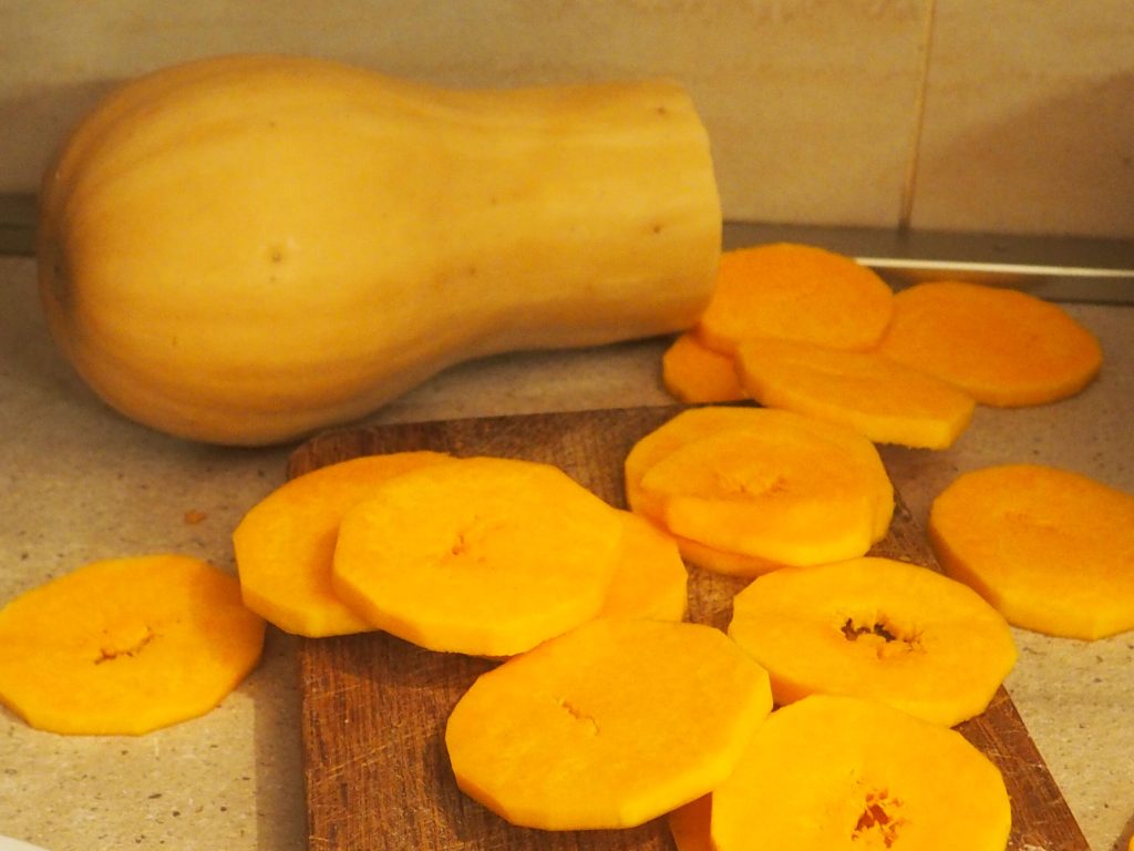 Waschen Sie den Kürbis, schälen Sie ihn mit einem Sparschäler und schneiden Sie ihn in etwa einen halben Zentimeter dicke Scheiben (meine Scheiben haben einen Durchmesser von etwa 5/6 Zentimetern).