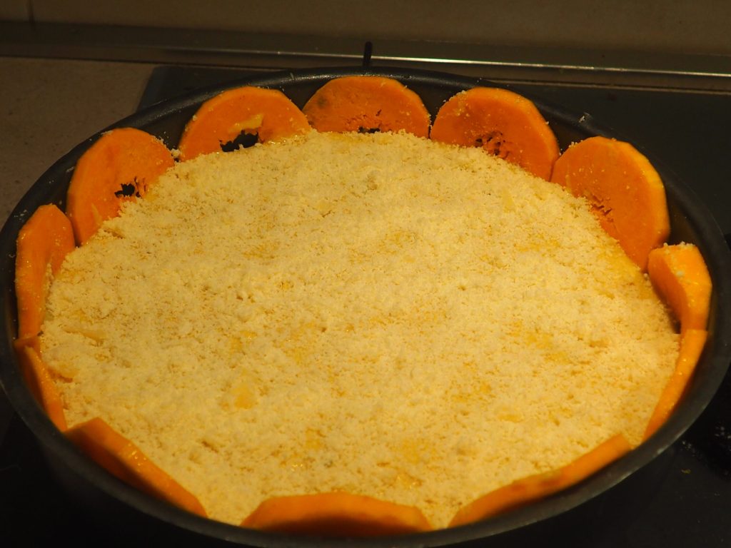 Ich empfehle, die Backform von 25 cm Durchmesser mit Backpapier auszulegen, das zuvor angefeuchtet und ausgewrungen wurde, um zu verhindern, dass der Teig klebt. Bestreichen Sie das Backpapier mit Öl, streuen Sie Salz, Salbeiblätter und Rosmarin darüber. Legen Sie die Kürbisscheiben so, dass sie sowohl den Boden als auch die Seite der Form bedecken, und streuen Sie dann Paniermehl darüber, besonders in die Lücken, wo kein Kürbis ist.