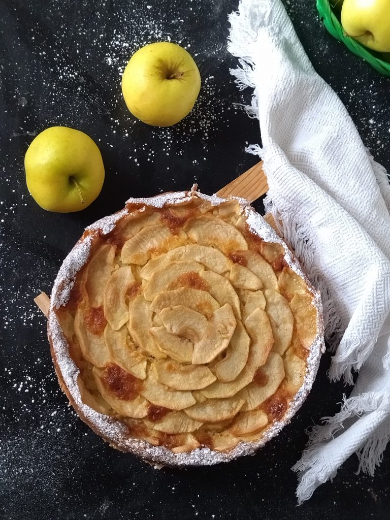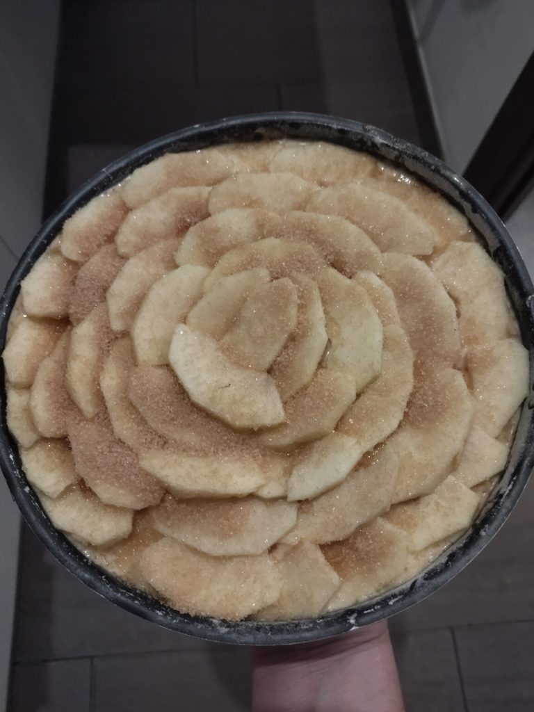 Die aufgehobenen Apfelscheiben auf der Oberfläche anordnen, mit etwas Rohrzucker bestreuen und im Ofen bei 180° für etwa 50/55 Minuten backen.