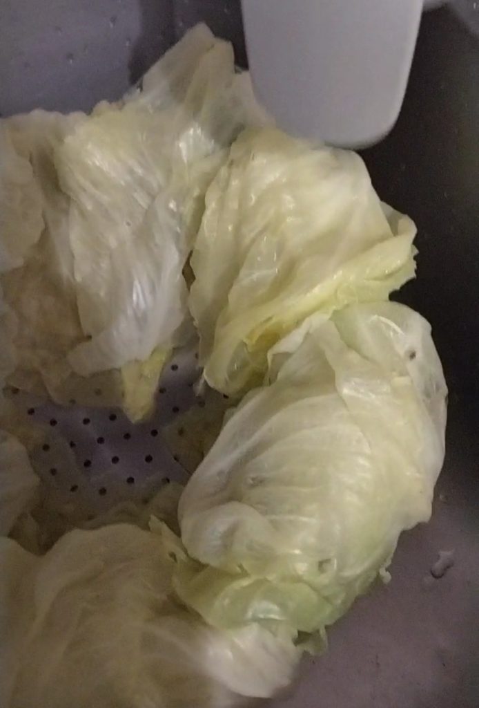 Lassen Sie sie in einem Sieb abtropfen, um das überschüssige Wasser zu entfernen. Wenn Sie möchten, können Sie sie an den Rändern des Siebs anlehnen. Die kleineren Blätter sowie das Herz des Kohls beiseitelegen.