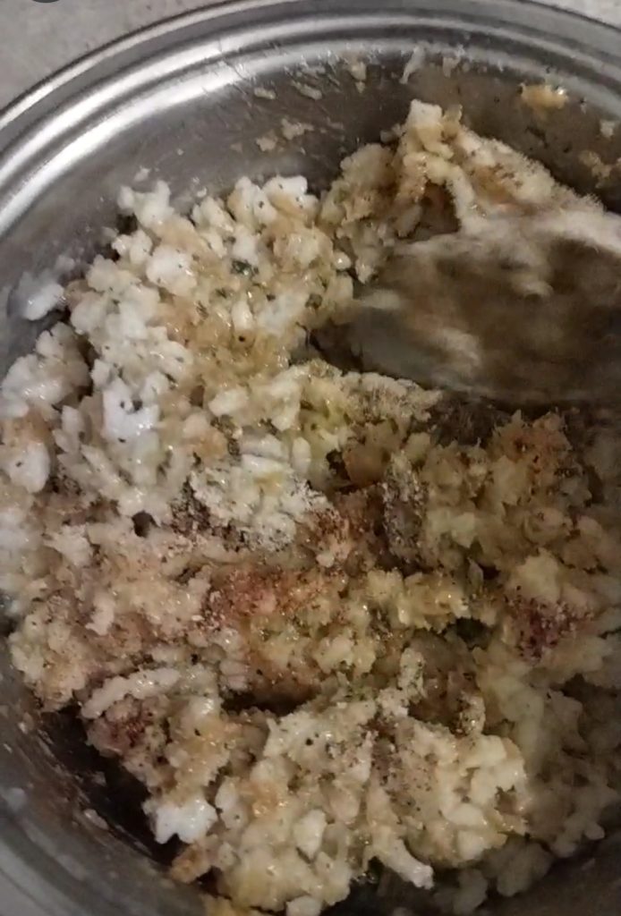 Würzen Sie nach Belieben mit den Gewürzen, passen Sie das Salz an und beträufeln Sie es mit etwas Öl. Gut mischen, um alle Zutaten gut zu verbinden.