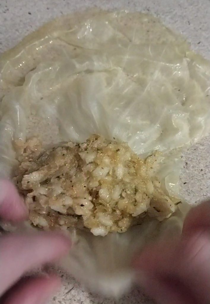 Nehmen Sie nun ein Kohlblatt und füllen Sie es mit einem großzügigen Löffel Füllung.