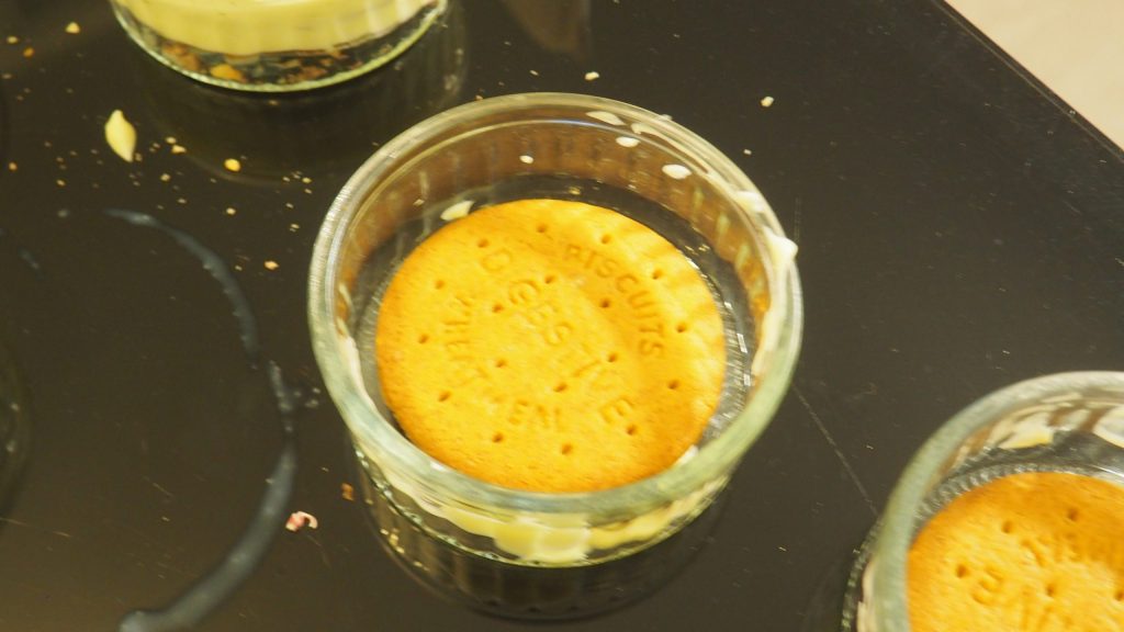 Bedecken Sie den Boden eines Bechers mit einem Durchmesser von 8 cm und einer Höhe von 3,5 cm mit etwas zerbröckelter Schokolade und Haselnüssen (ich habe sie in einen Gefrierbeutel gelegt und mit einem Fleischklopfer zerdrückt). Geben Sie die Milch auf einen Teller, tauchen Sie einen Digestive-Keks leicht von beiden Seiten hinein und legen Sie ihn in den Becher.