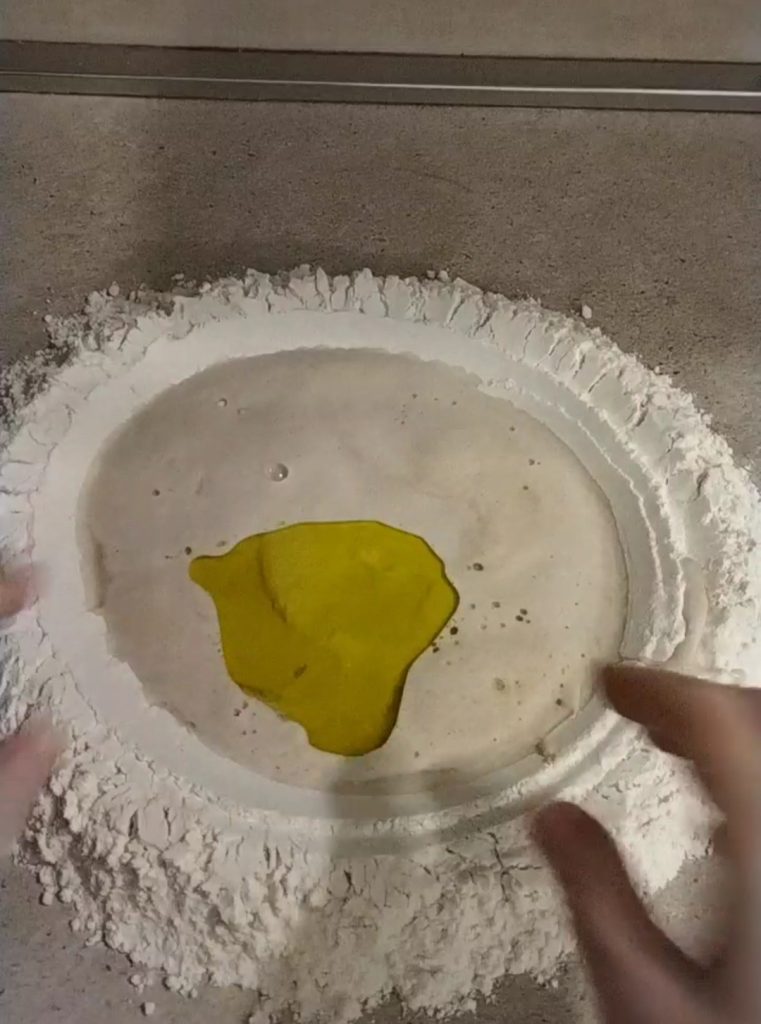 Geben Sie das Mehl auf eine Arbeitsfläche, fügen Sie den Vorteig, das Wasser und das Öl hinzu, und beginnen Sie, den Teig zu kneten.