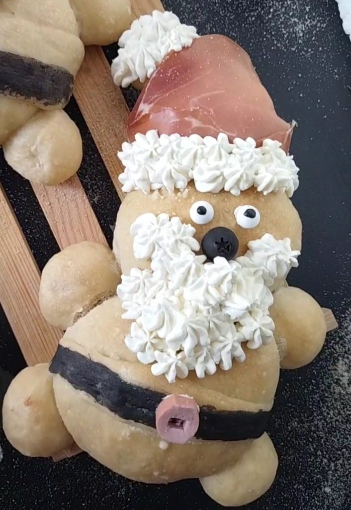 Die Weihnachtsmann-Brötchen sind weiche Pizzateigbällchen, gefüllt mit Schinken und Käse, ideal um Ihren festlichen Tisch zu verschönern und als Beilage statt Brot zu verwenden. Sie sind einfach zuzubereiten, sehr lecker und hübsch. Wenn Sie keine Bierhefe haben, können Sie sie durch 200 g Sauerteig ersetzen, in diesem Fall verlängert sich die Gehzeit erheblich.