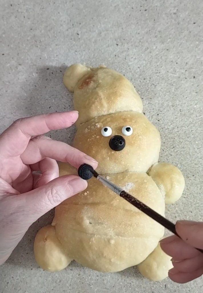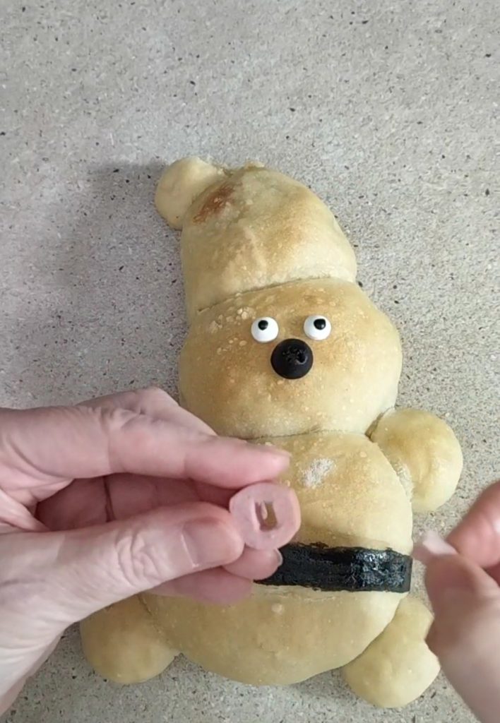 Sobald sie aus dem Ofen sind, lassen Sie sie leicht abkühlen und dekorieren Sie sie. Ich habe Zuckeraugen verwendet, aber man könnte auch eine halbe schwarze Olive und Frischkäse verwenden. Für die Nase habe ich eine halbe schwarze Olive verwendet und den Gürtel dekoriert, indem ich mit einem feuchten Pinsel eine Tablette Aktivkohlepulver bestrichen habe. Verwenden Sie ein wenig Frischkäse, um die Teile zu befestigen.