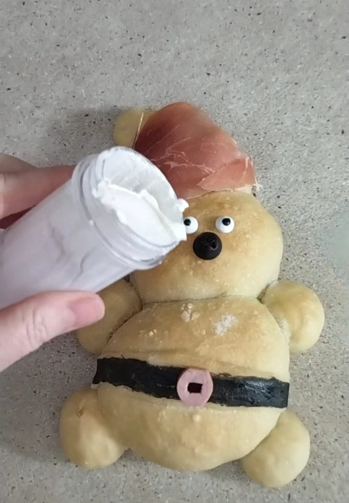 Füllen Sie eine Spritze mit Frischkäse und dekorieren Sie das Gesicht des Weihnachtsmannes.