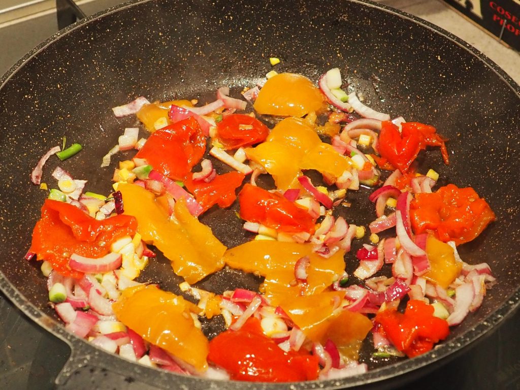 Geben Sie wenig Öl in eine große Pfanne, fügen Sie die fein gehackte Zwiebel und die Paprika unter Trester hinzu.
