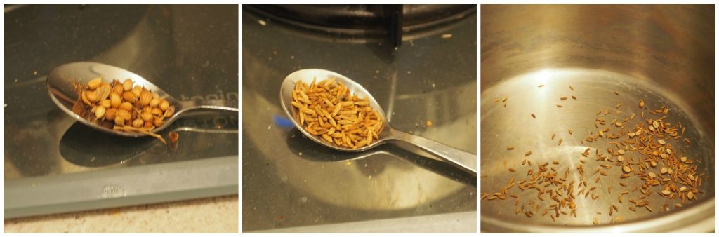 Setzen Sie einen ausreichend großen Topf auf den Herd, geben Sie die Koriander- und Kreuzkümmelsamen hinein (zuvor leicht im Mörser zerstoßen, um ihr gesamtes Aroma freizusetzen), und rösten Sie sie für ein paar Sekunden an.