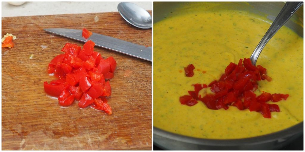 Schneiden Sie sowohl den Paneer als auch das zuvor gekochte oder gegrillte Huhn in ziemlich kleine Würfel.