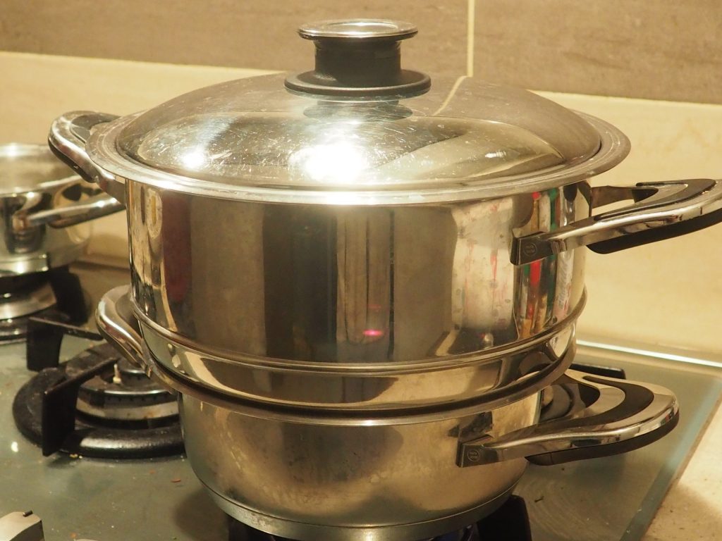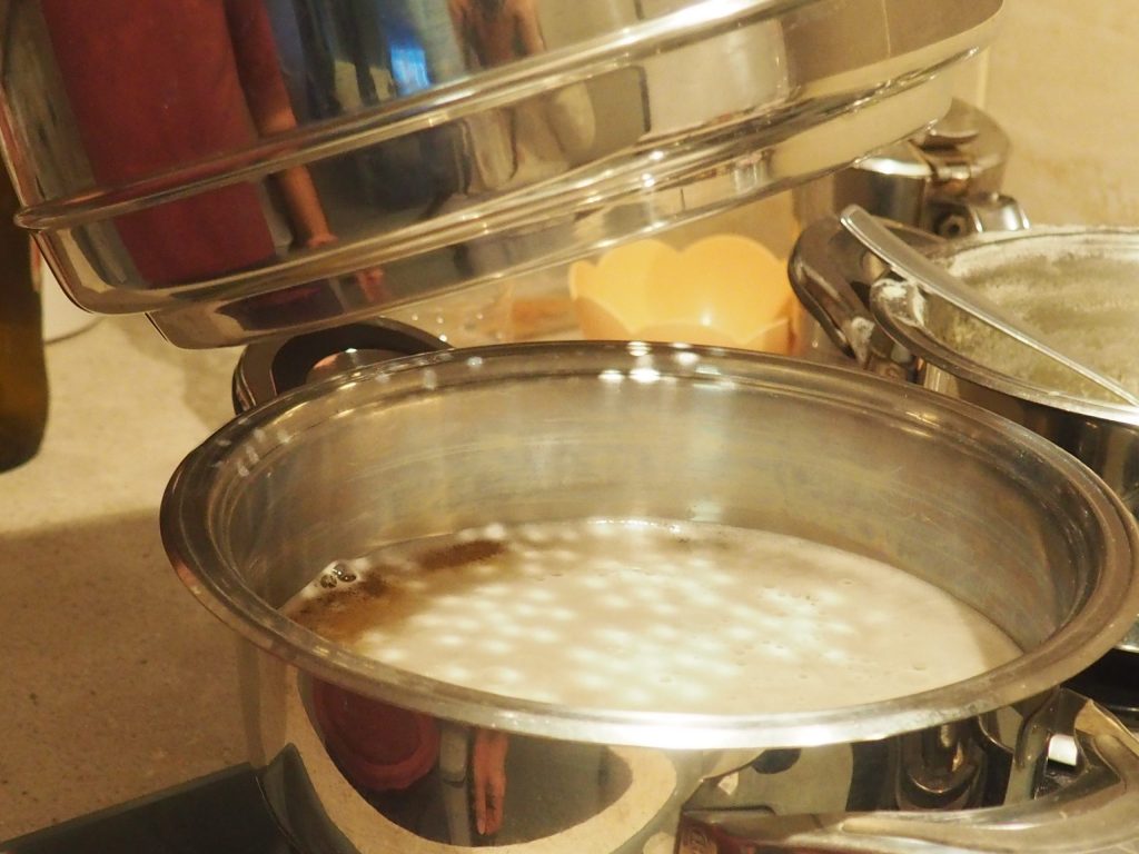Gießen Sie das Bier in einen Topf, stellen Sie darauf einen weiteren Topf, der für das Dampfgaren geeignet ist und einen durchlöcherten Boden wie ein Sieb hat.