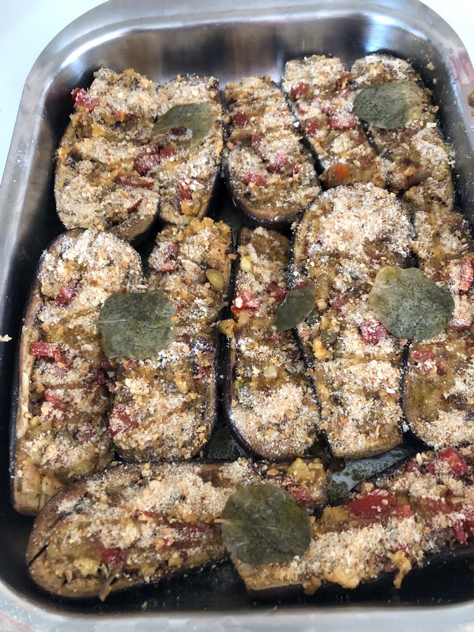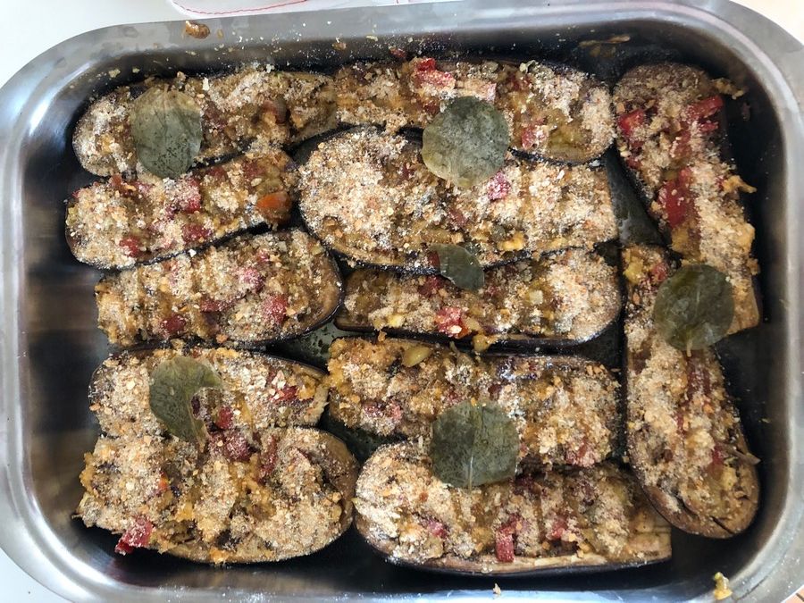 Schneiden Sie auch die kleinen Tomaten in Würfel und legen Sie sie beiseite, weichen Sie das altbackene Brot ein, entfernen Sie die Kruste und drücken Sie die Krume gut aus. In einer Schüssel alle Zutaten zusammenfügen, das Ei dazugeben und mit Salz und Pfeffer abschmecken, alles gut vermengen. In der Zwischenzeit haben wir die Auberginen bereits 10 Minuten im Ofen vorgebacken und abkühlen lassen, dann füllen wir sie mit der Mischung, eine großzügige Prise Semmelbrösel darauf und 15 Minuten im Ofen backen. Lassen Sie sie vor dem Servieren ruhen!