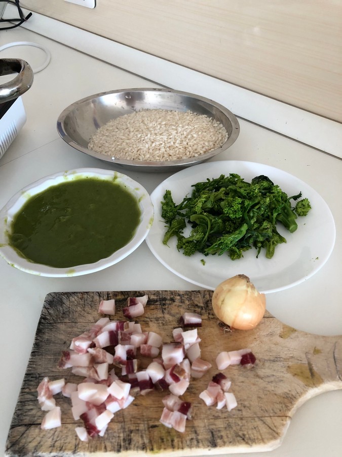 • In der Zwischenzeit haben wir einen Topf für das Risotto auf dem Herd, fügen 4 Esslöffel Olivenöl hinzu und die fein geschnittene Zwiebel, lassen es anbraten, dann fügen wir den Speck hinzu und sobald er durchsichtig wird, nehmen wir ihn heraus und stellen ihn beiseite. Wir fügen den Reis hinzu und lassen ihn rösten, nach 3-4 Minuten fügen wir die Brühe hinzu und lassen sie absorbieren. In einer kleinen Pfanne braten wir mit einem Esslöffel Öl 100 g Rübstiel (ich habe die blühenden Spitzen gewählt) an, würzen mit Salz und Pfeffer und schalten nach ein paar Minuten aus und stellen es beiseite.