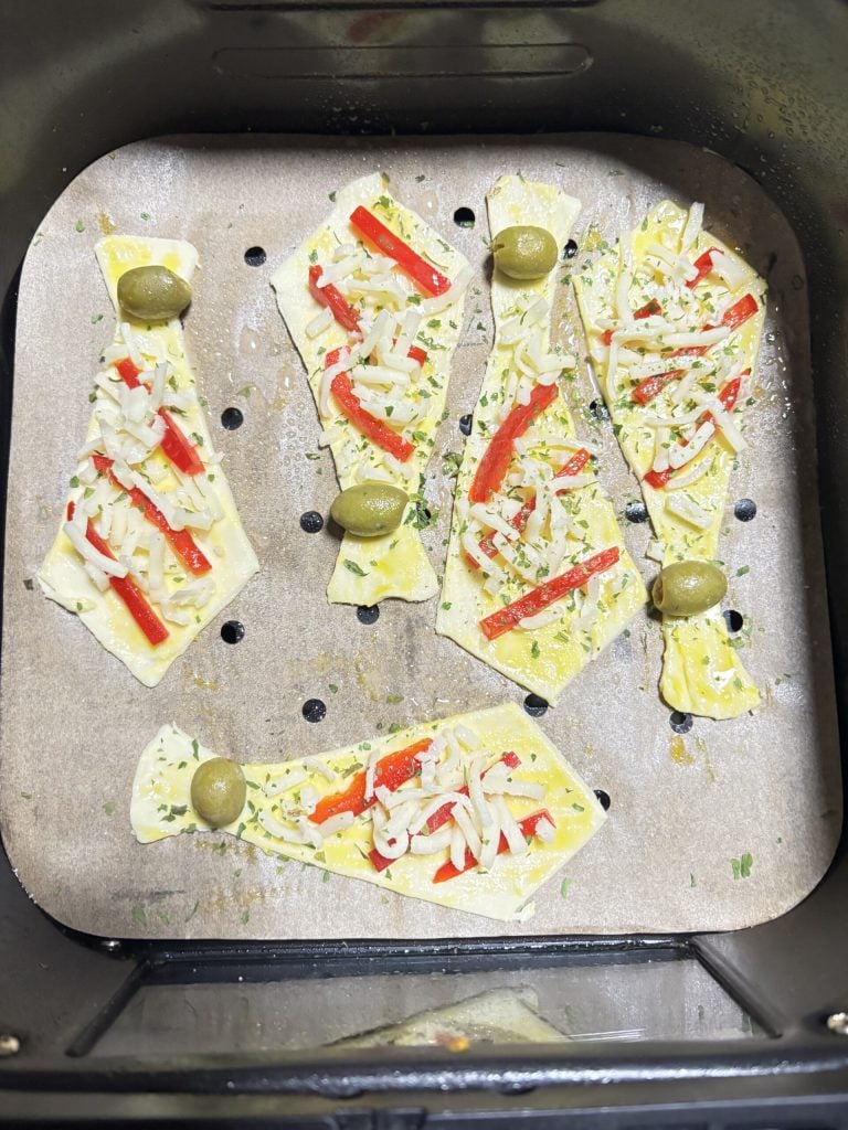 Wir backen sie in der Heißluftfritteuse bei 165 Grad für 15 Minuten.