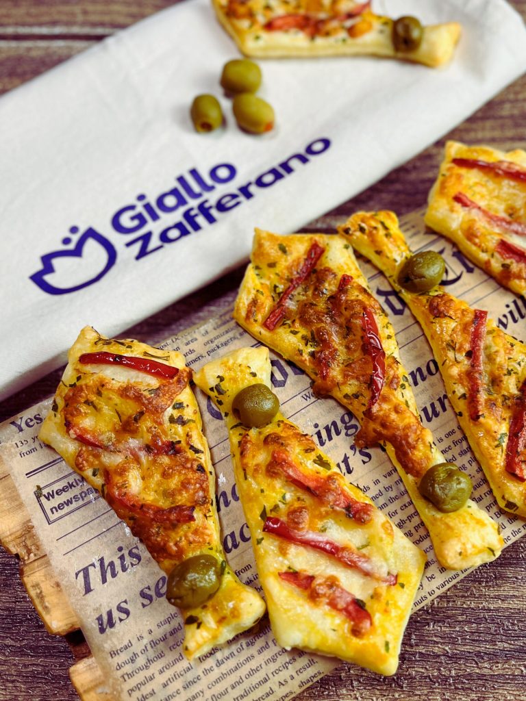 Unsere Blätterteig-Krawatten mit Oliven und Paprika sind bereit, sowohl heiß als auch kalt serviert zu werden.